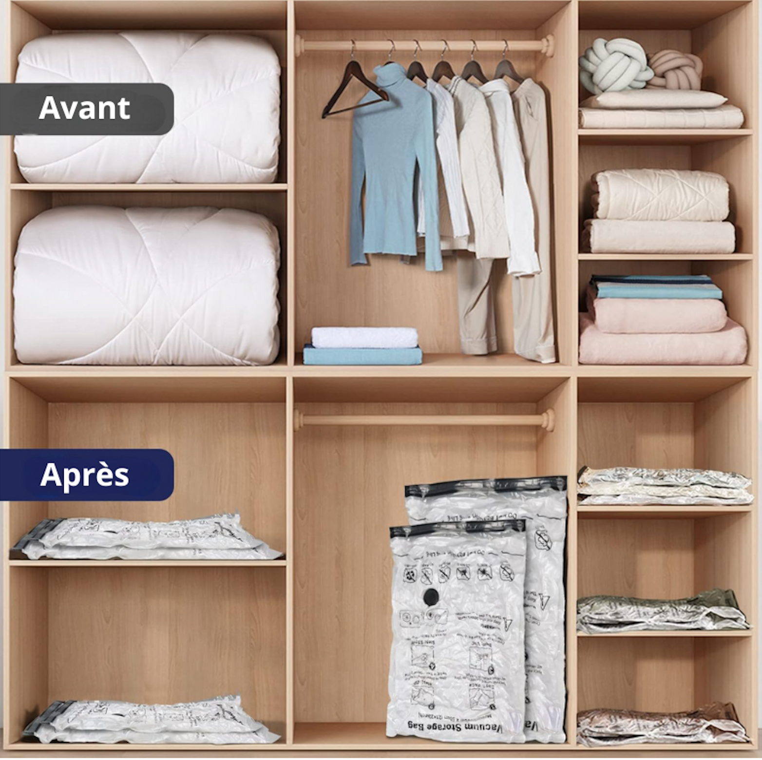 Vous manquez constamment d'espace dans vos pancartes ? Les sacs sous vide transforment instantanément votre rangement en créant jusqu'à 80% d'espace supplémentaire. Fini l'angoisse des armoires qui débordent et des tiroirs impossibles à fermer ! Imaginez pouvoir ranger toutes vos couettes d'hiver, couvertures et vêtements de saison dans un espace réduit, libérant des étagères entières pour d'autres usages. Cette solution simple mais remarquablement efficace change la vie de milliers de foyers français confrontés au manque d'espace chronique.
